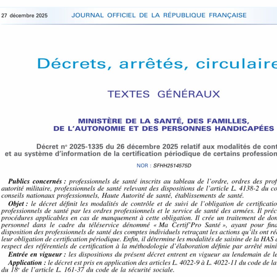 Deux décrets attendus, relatifs à la certification périodique, ont été publiés le 27 décembre 2025. […]